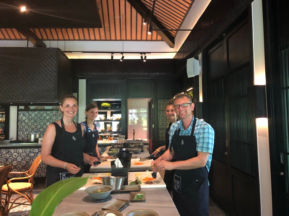 We toured their garden, then took a van to town to shop at the old market. Then, we came back to the resort and whipped up four delicious dishes in their very impressive kitchen.